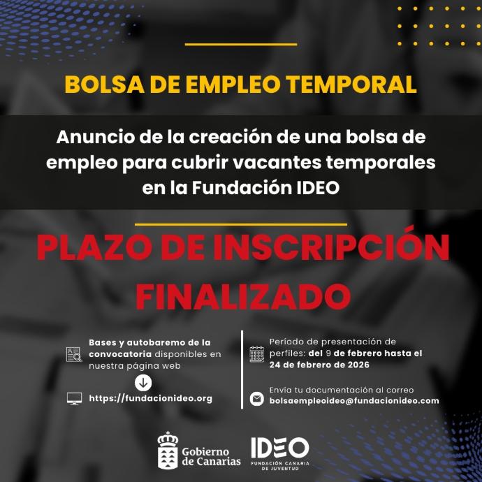 Se informa que, una vez cerrado el plazo de recepción de candidaturas para la Bolsa de Empleo el pasado 24 de febrero de 2026, nos encontramos actualmente en proceso de revisión y valoración de las solicitudes presentadas.